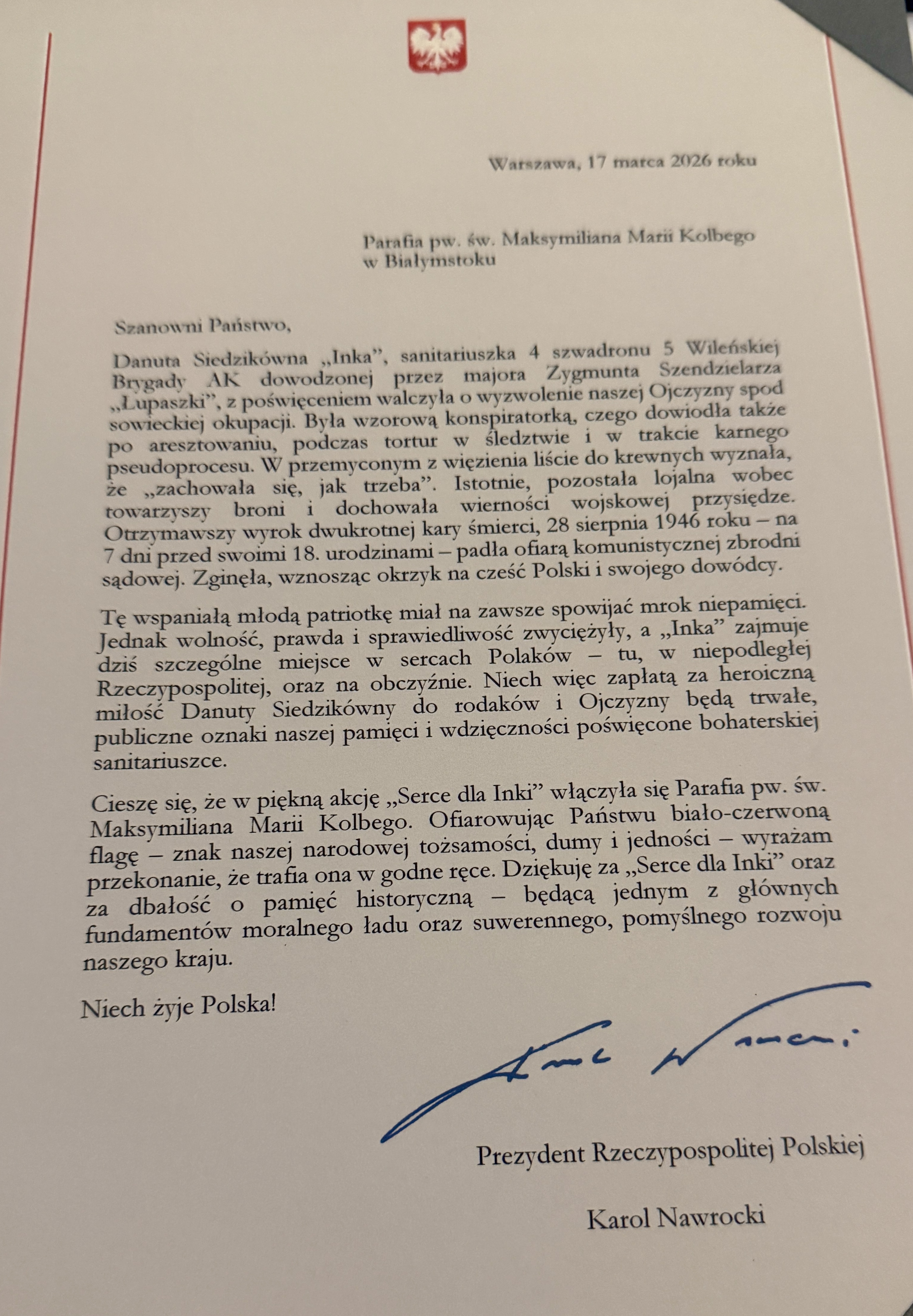 Odsłonięcie i poświęcenie tablicy “Serce dla Inki” w kościele Swiętego Maksymiliana w Białymstoku 17 marca 2026 roku